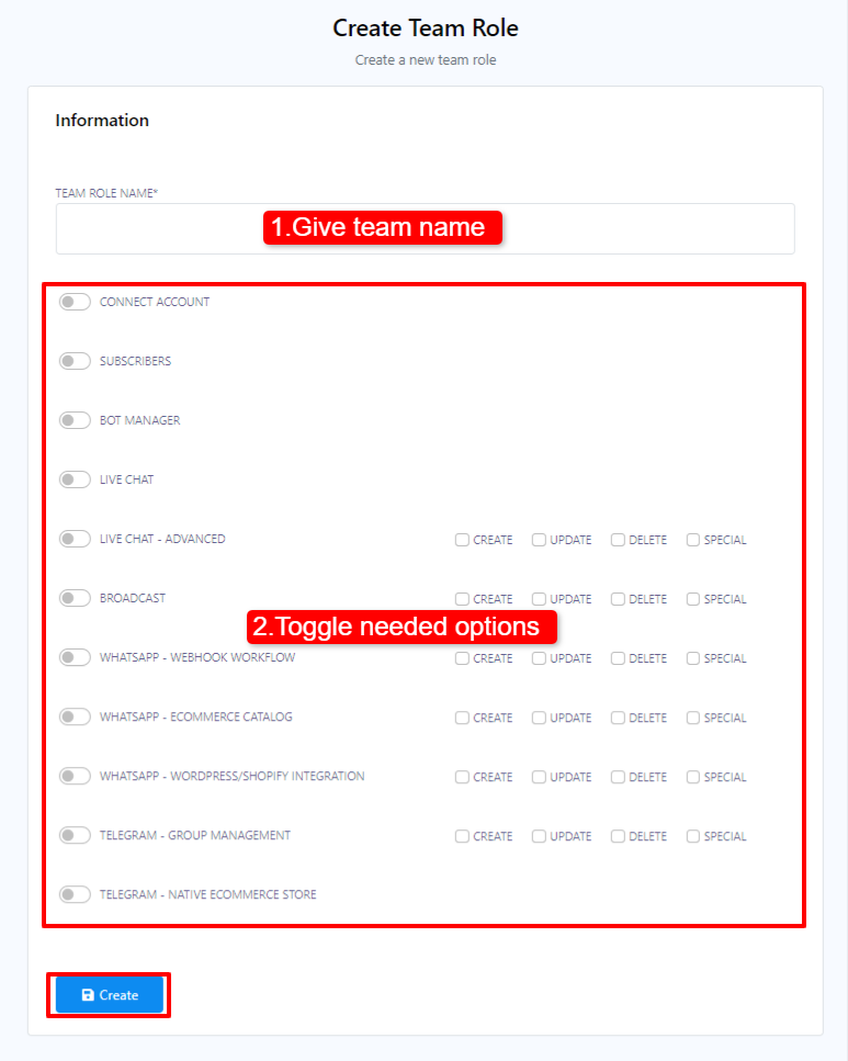 En nuestra plataforma de chatbot, un rol de equipo define las tareas específicas asignadas a cada equipo que gestiona diferentes tareas. Un equipo puede estar compuesto por varios miembros. El proceso para añadir miembros al equipo se describe en la sección "Equipo" de nuestra plataforma. Para asignar tareas a los miembros del equipo, primero debe establecer un rol de equipo y luego asignar permisos para las tareas que desea que gestionen.