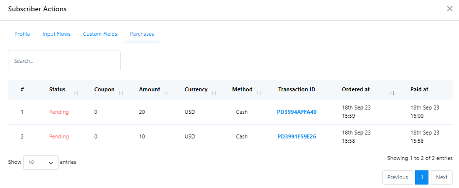 Historial de compras: haga clic en Compras para consultar cada compra que ha realizado el suscriptor.