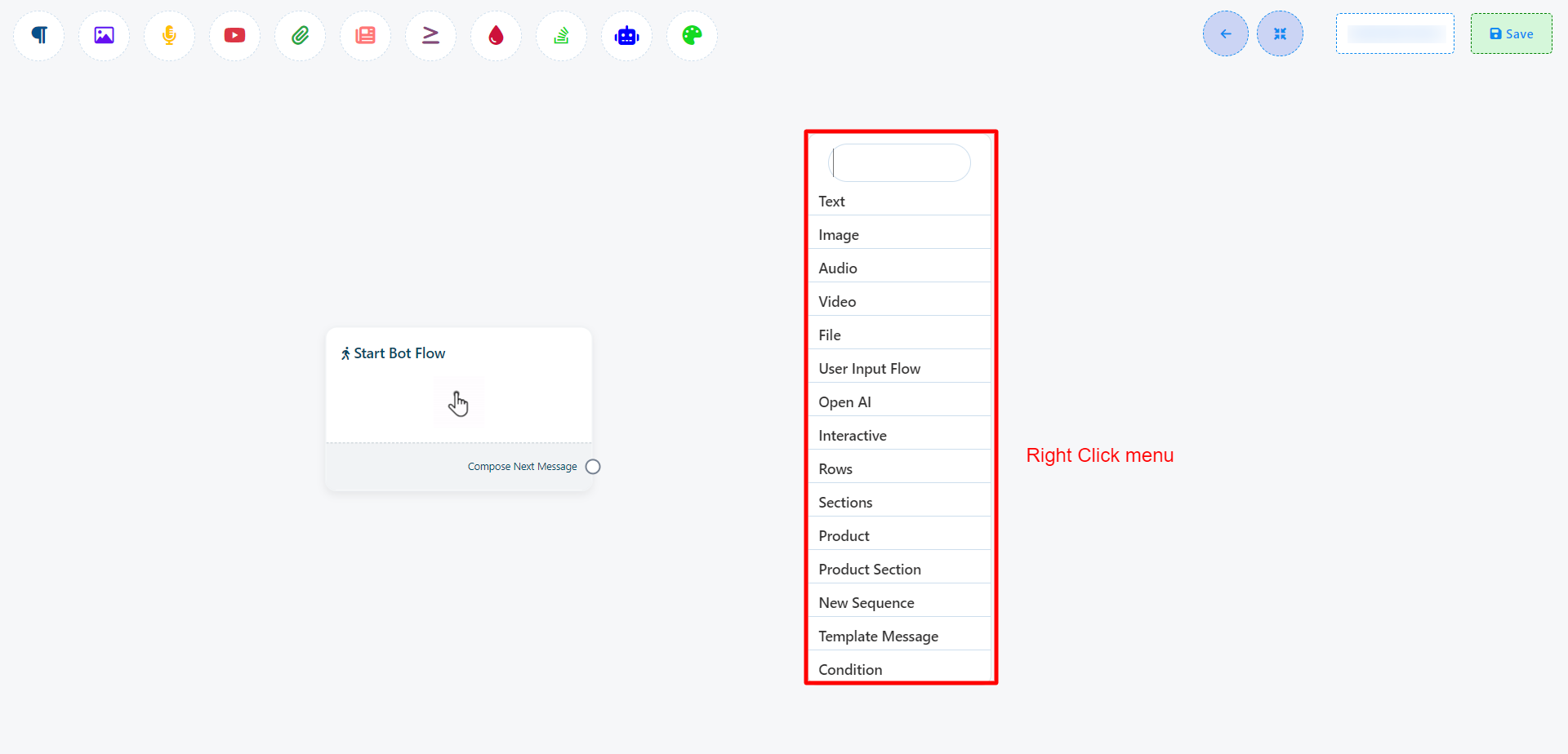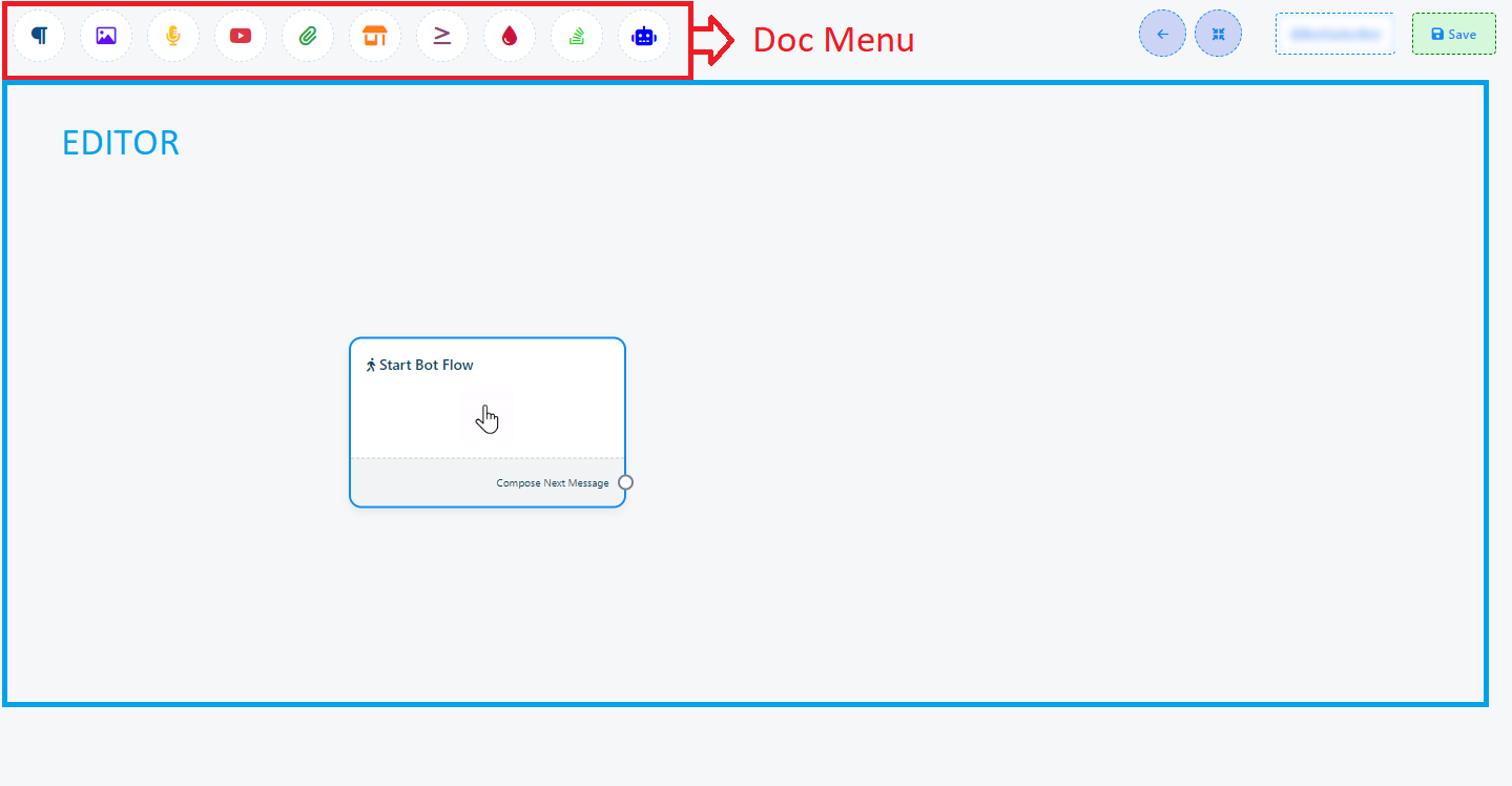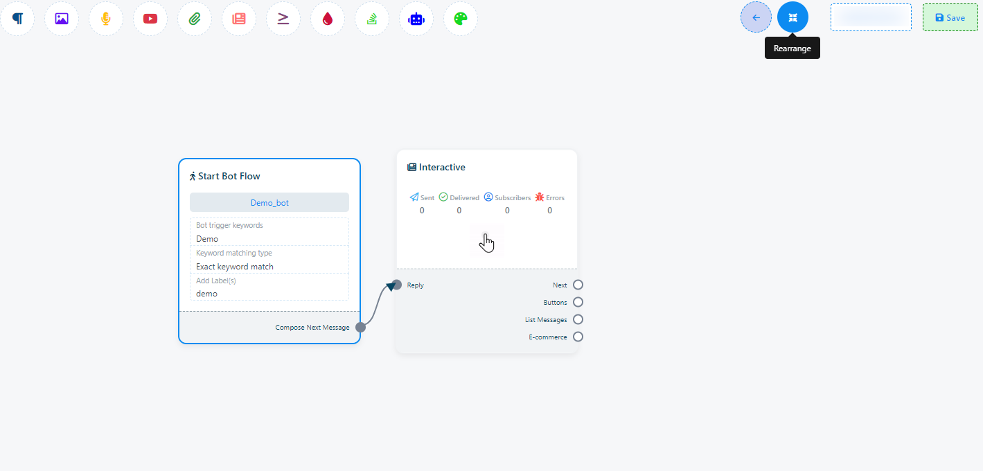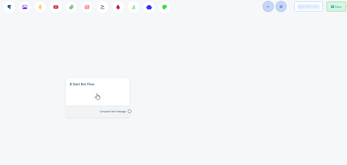 Una vez que haya completado la configuración de 'Iniciar flujo de bot', encontrará un socket: 'Redactar siguiente mensaje'. Estos sockets le permiten agregar varios componentes y configurarlos.