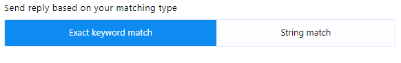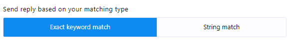 - Tipo de coincidencia: Puede elegir el tipo de coincidencia haciendo clic en uno de los dos botones disponibles: "Coincidencia exacta de teclado" o "Coincidencia de cadena". Por defecto, está seleccionada la opción "Coincidencia exacta de teclado". Con esta opción, el bot se activará solo si la entrada del usuario coincide exactamente con la palabra clave. Por el contrario, con "Coincidencia de cadena", el bot se activará si la entrada del usuario coincide parcialmente con la palabra clave.