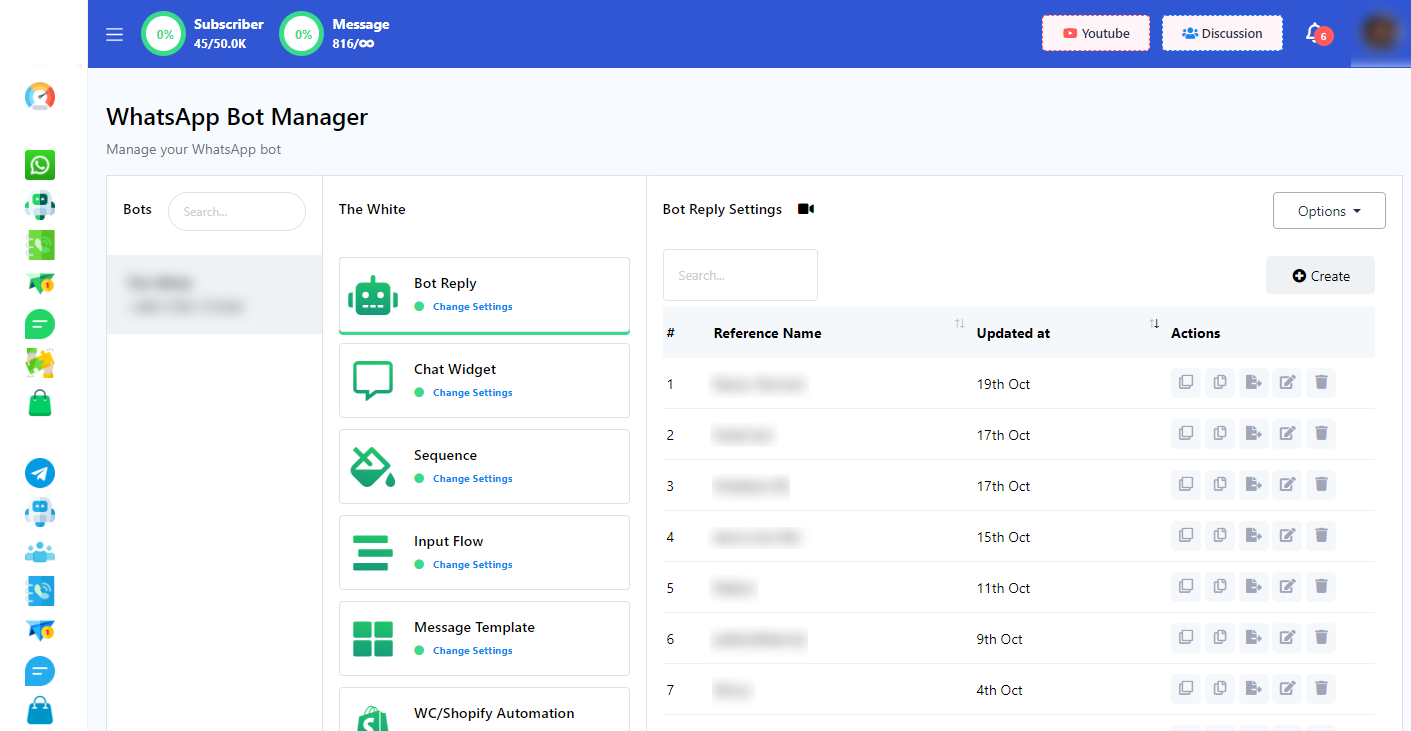 - En `Bot Reply` encontrará `Crear`, haga clic en él y en la nueva pestaña se iniciará el flujo de creación de bots.
