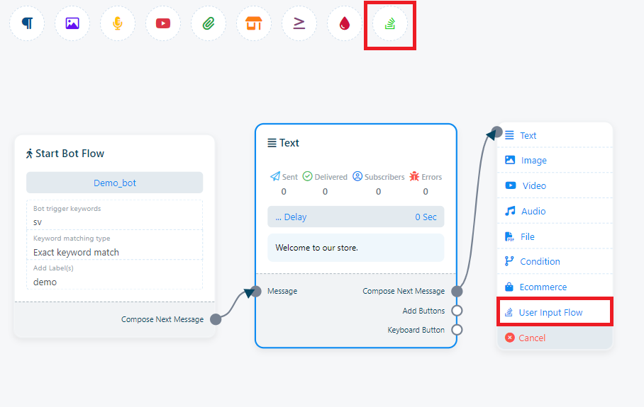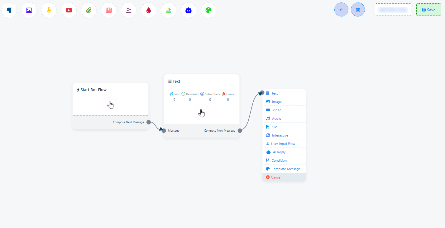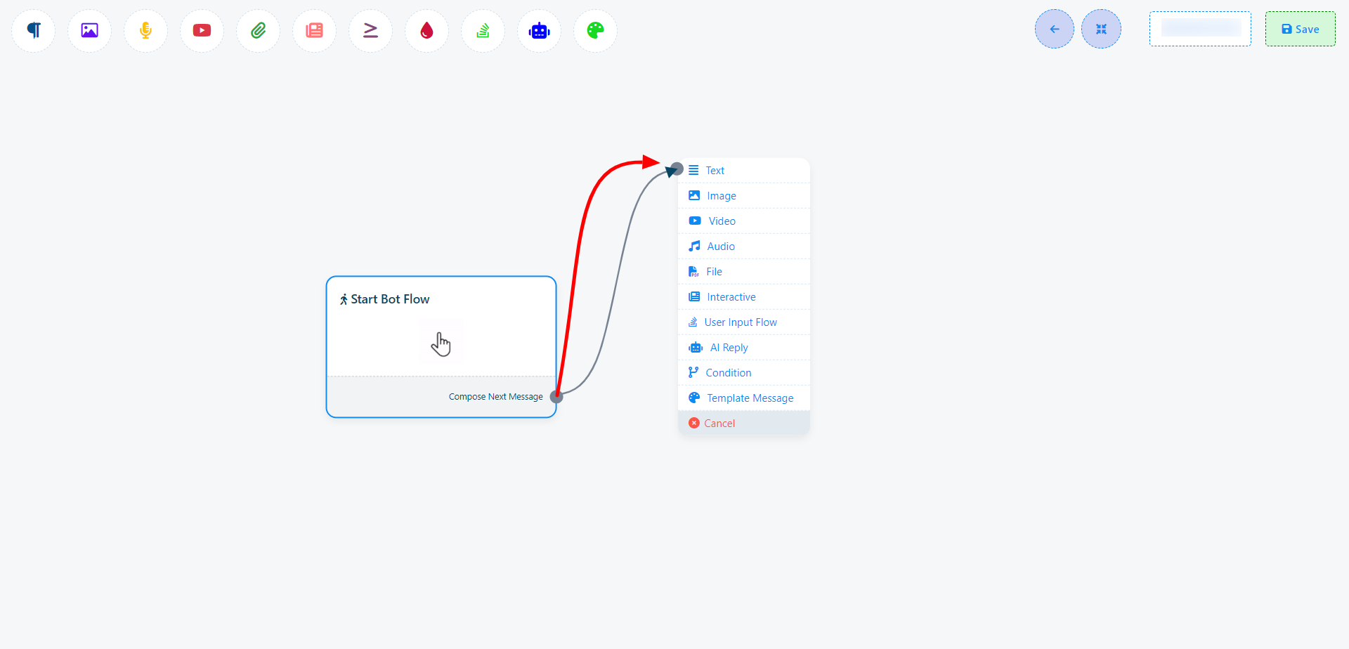 Por ejemplo, supongamos que arrastra desde el siguiente socket de salida del componente de texto. Esto activará un menú desplegable con diferentes componentes como Texto, Imagen, Vídeo, Audio, Archivo, Comercio electrónico, Flujo de entrada del usuario y un botón Cancelar. En este menú desplegable, puede seleccionar el componente deseado. Si desea cancelar y no agregar ningún componente, simplemente haga clic en el botón Cancelar.