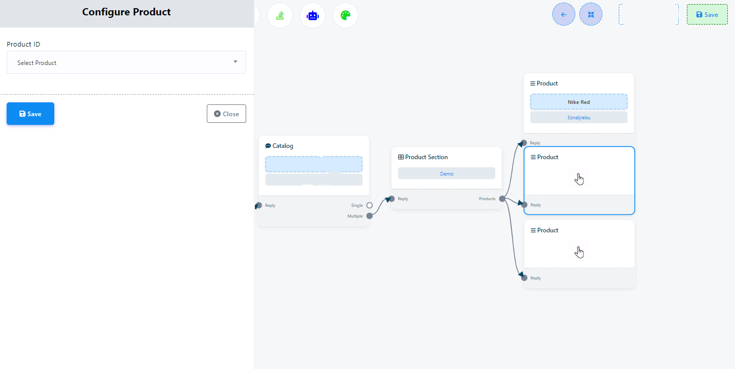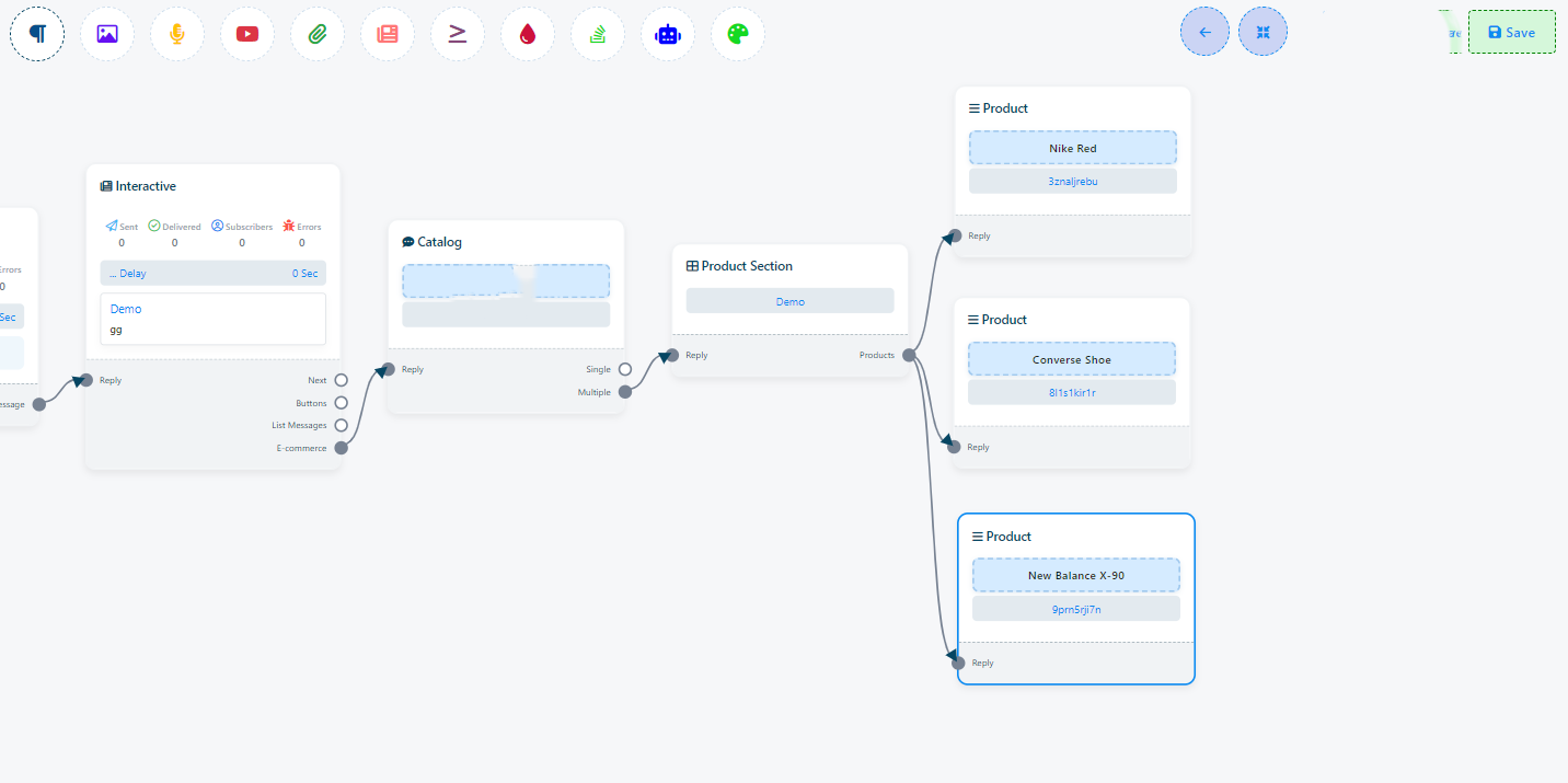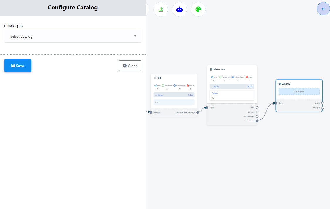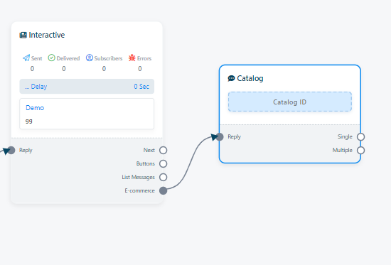 - Después de agregar el elemento "Catálogo" a tu flujo, haz doble clic en él. Esto mostrará el campo "ID del catálogo", donde podrás ingresar tu ID del catálogo de WhatsApp.