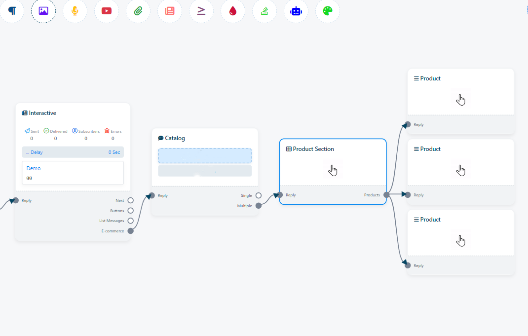 Si desea agregar "Comercio electrónico", debe necesitar un "Interactivo" y luego puede agregar su comercio electrónico al Bot Flow).