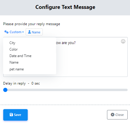 También puedes insertar variables personalizadas en tu mensaje de respuesta. Haz clic en el botón "Personalizar", selecciona una variable del menú desplegable y se reemplazará con el valor real antes de enviar el mensaje.