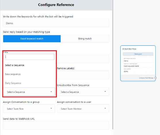 - Keyword Triggering: To initiate the bot using specific keywords,double-click on the `Start Bot Flow` element. This action will open the `Configure Reference` in the left side, featuring ten fields and two buttons. In the first field, you can input a list of comma-separated keywords. When a user enters text in the messaging window that matches any of these keywords, the bot will be triggered.