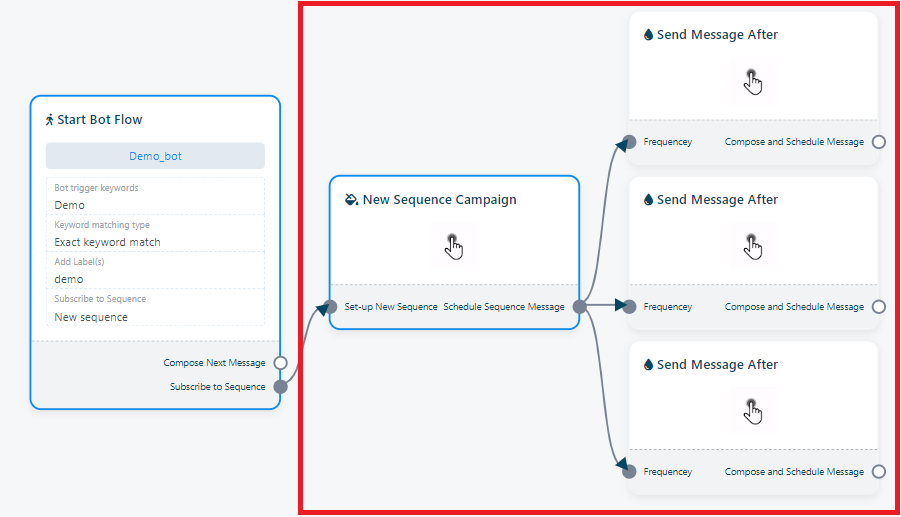 Al completar los pasos anteriores, descubrirá tres componentes S`end Message After` adicionales adjuntos al componente `sequence campaign`.