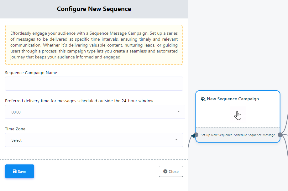 - Haga doble clic en «Nuevas Campañas de Secuencia». En este paso, especifique un nombre para la Campaña de Secuencia completando el campo «Nombre de la Campaña de Secuencia».