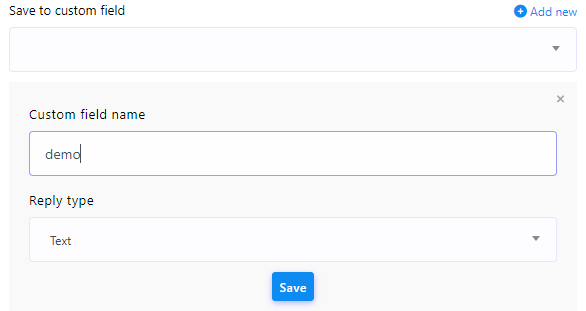 - Guardar en campo personalizado: Puede guardar los datos de las respuestas en una tabla de datos específica. Si necesita un nuevo campo personalizado, puede crearlo haciendo clic en el botón "Agregar nuevo".