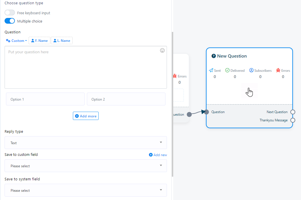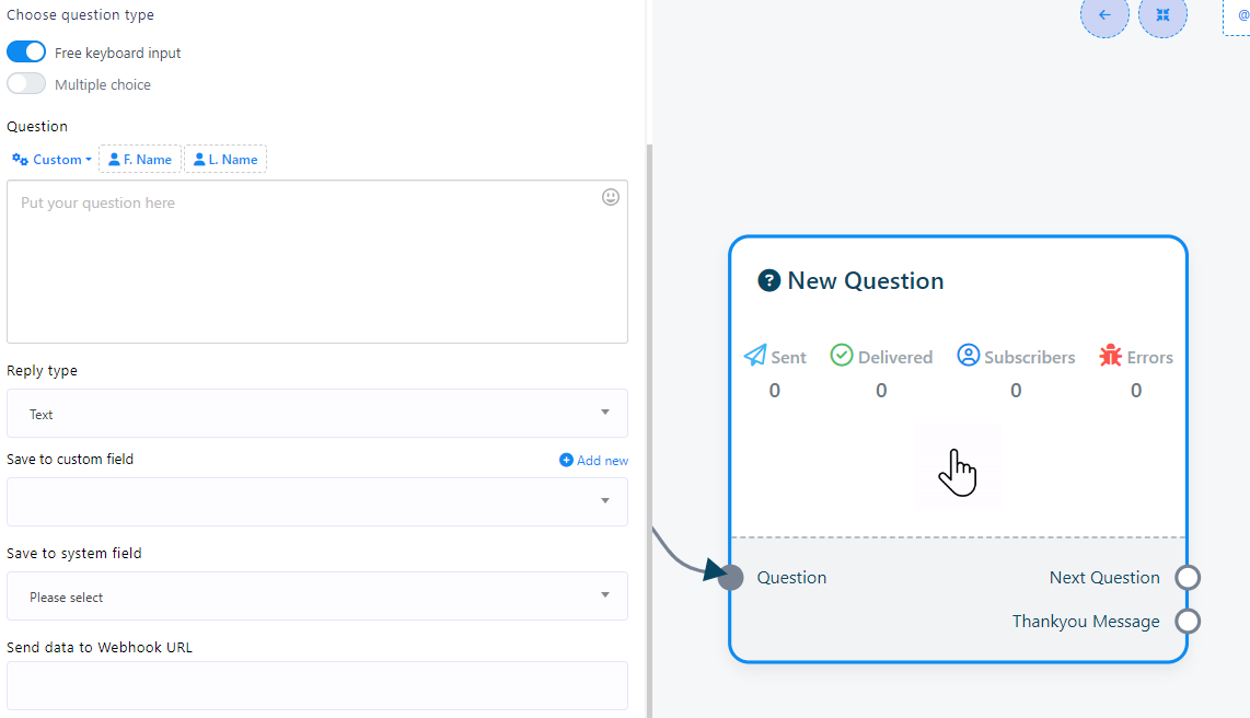 - Haga doble clic en el componente "Nueva pregunta" para acceder a dos botones: "Entrada libre de teclado" y "Opción múltiple". Estos botones determinan el tipo de preguntas que desea formular.