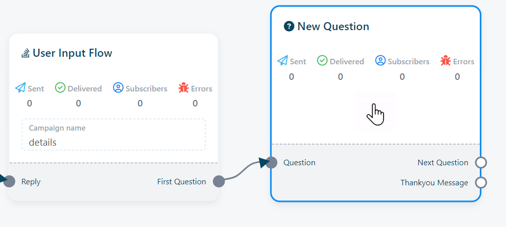 - Tras guardar el flujo de entrada del usuario, aparecerá automáticamente el componente "Nueva pregunta". También puede arrastrar el socket "Primera pregunta" y colocarlo en el flujo del bot para que aparezca el componente "Nueva pregunta".