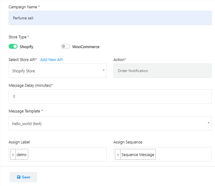 - Seleccione la acción como "Notificación de pedido".