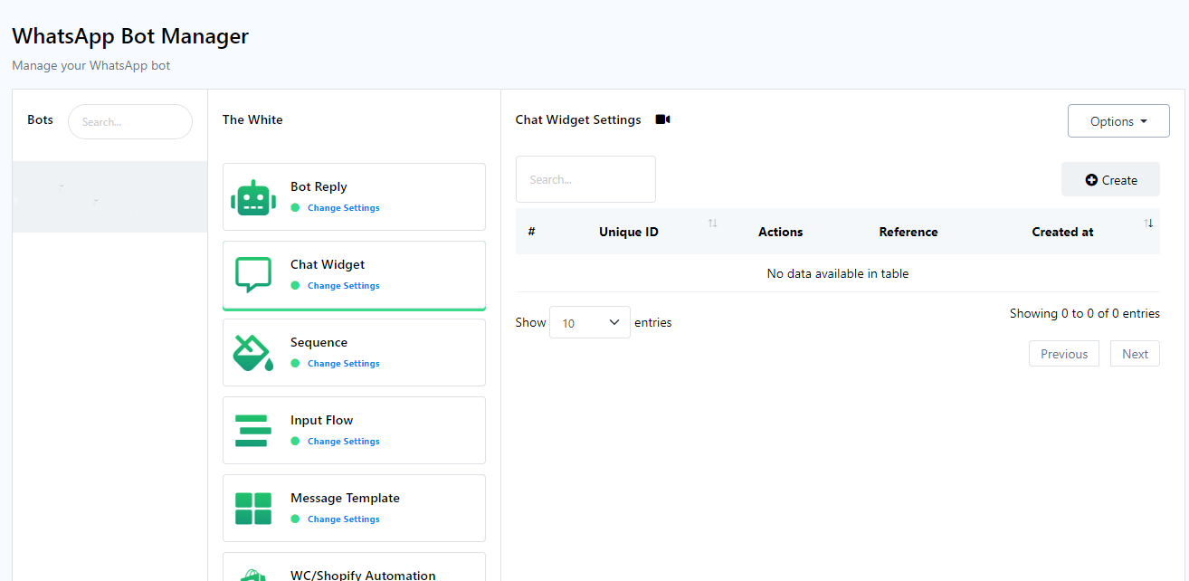 - En el Administrador de Bots de WhatsApp, selecciona la sección "Widget de Chat" y haz clic en el botón "Crear". Asegúrate de que la cuenta del bot de WhatsApp para la que se creará el widget de chat esté seleccionada.