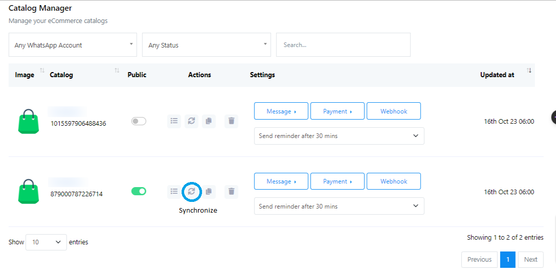 - En "Acciones", puede ver los productos del catálogo. Sincronice los productos añadidos o actualizados.